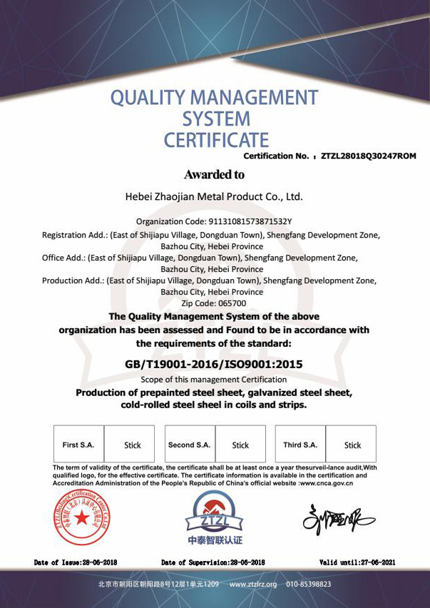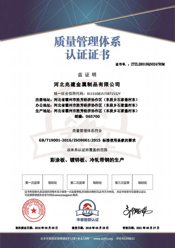 近日,中泰智聯(lián)認證有限公司對我公司進行了ISO9001:2015質量管理體系審核。經(jīng)過審核組專家的全面、嚴格、細致的指導和審核,確認我公司質量管理體系符合ISO9001:2015質量體系標準的要求,最終順利通過ISO9001:2015質量管理體系的認證!