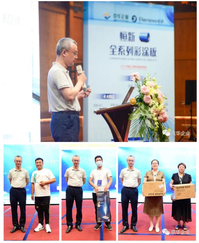 在接下來的一小時時間里,京華企業(yè)“恒新”品牌營銷副總李明曄先生,從企業(yè)實力和品牌定位,新型鋅鋁鎂基材以及全系列“恒新”彩涂產(chǎn)品線,“恒新”產(chǎn)品定制服務三方面向與會嘉賓做了全面的講解,全方位立體化向大家詳細闡述了“恒新”產(chǎn)品解決方案的獨特價值,以創(chuàng)新設計理念,幫助綠色建筑的節(jié)材,節(jié)水,節(jié)能,提升環(huán)境舒適度等各方面達成極大提升,以綠色理念幫助廣大客戶實現(xiàn)彩涂產(chǎn)品銷量的可持續(xù)增長?,F(xiàn)場的客戶們表示認可與支持,對于“恒新”品牌給用戶帶來的賦能升級,轉(zhuǎn)型共生,給予了很高的期待! 隨后,李總就現(xiàn)場嘉賓提出的問題做出了詳細解答,并隨機從提問的嘉賓中抽取多名幸運嘉賓,贈與豐厚禮品,平板電腦、蒸汽拖把等大獎一一揭曉,現(xiàn)場氣氛熱烈愉快。