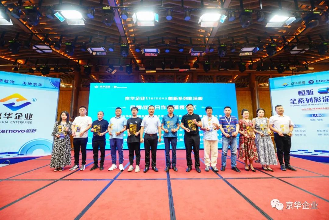 在現(xiàn)場300多位嘉賓的共同見證下,“恒新”品牌系列彩涂產(chǎn)品的經(jīng)銷商頒授儀式隆重舉行,京華企業(yè)總經(jīng)理陳鐵柱先生向聯(lián)合主辦會議的京津冀地區(qū)十二家經(jīng)銷商代表頒發(fā)了恒新品牌“合作共贏、共創(chuàng)未來”的授權牌,感謝大家長期以來與公司戮力同心,持續(xù)提升著京華彩涂板在京津冀地區(qū)的行業(yè)標桿形象。 京華企業(yè)與廣大客戶攜手共進,實現(xiàn)共贏共生,不斷創(chuàng)新與超越,努力鑄就綠色建材實力領先品牌,打造屬于整個金屬涂鍍行業(yè)的美好明天!