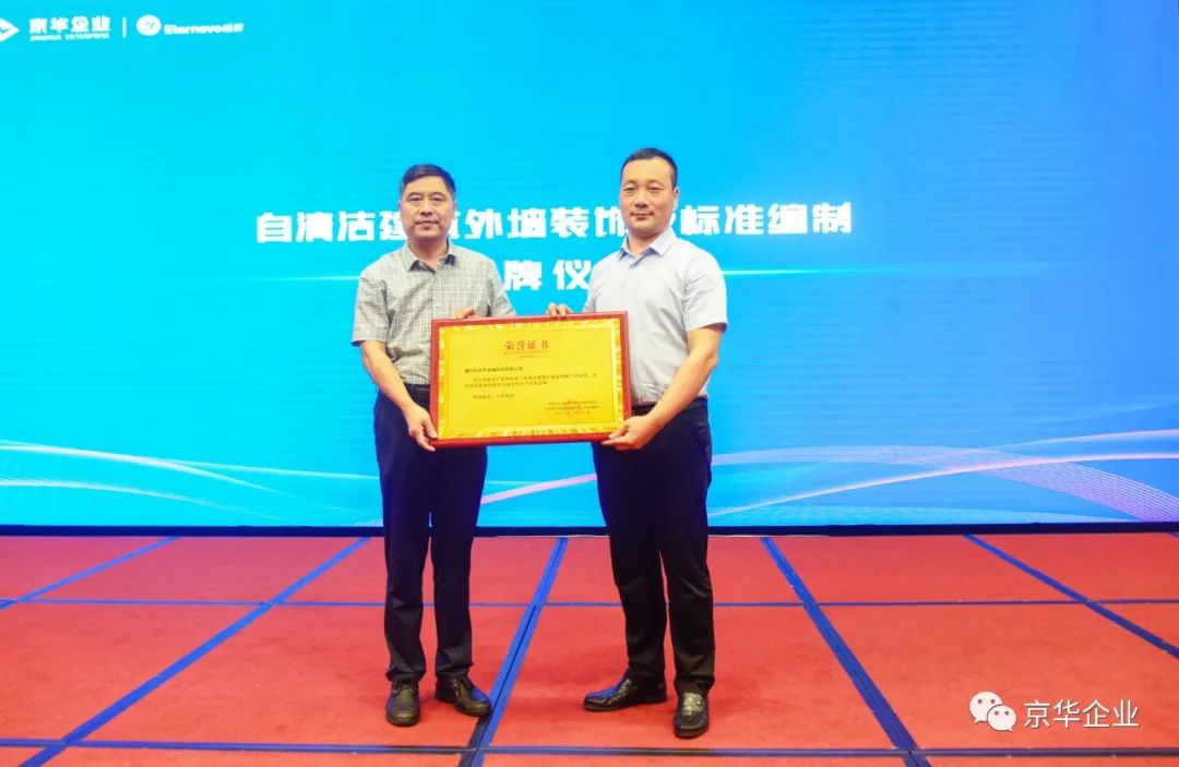 來自中國建材規(guī)劃院應用技術開發(fā)研究院/中關村人居環(huán)境工程與材料研究院副院長王忠勇先生就綠色建筑及綠色建材課題向現(xiàn)場嘉賓進行了分享,并向京華企業(yè)授予 “自清潔建筑外墻裝飾板標準編制” 榮譽牌,對京華企業(yè)參與建筑板材生產(chǎn)標準編制表示鼓勵與肯定。